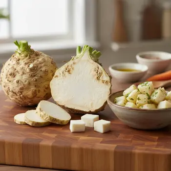 - Seler korzeniowy: bardziej wyrazisty smak, świetny do zup, wywarów, purée i pieczonych potraw.